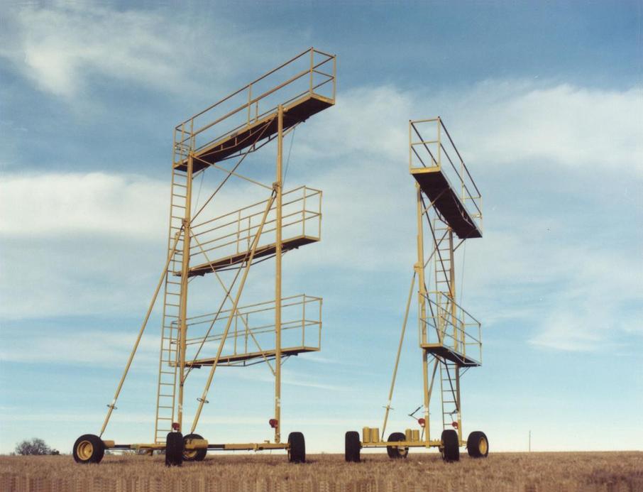 Available for rental lease or sale rustgo work platforms are portable scaffold units that can be towed at highway speeds by a standard quarter ton truck.